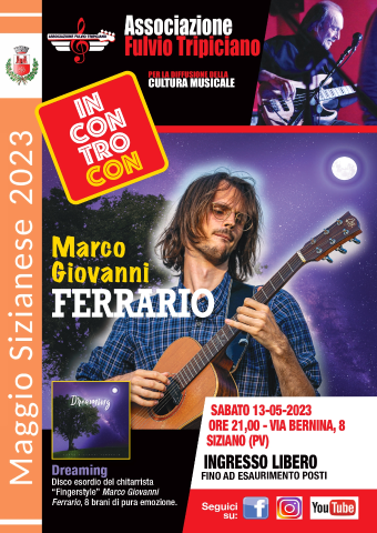 Si informano i cittadini che, nell'Ambito degli eventi del Maggio Sizianese 2023, l'Associazione Fulvio Tripiciano organizza uno spettacolo musicale a cui parteciperà il chitarrista Marco Giovanni Ferrario, presentando il proprio disco d’esordio intitolato “Dreaming”.