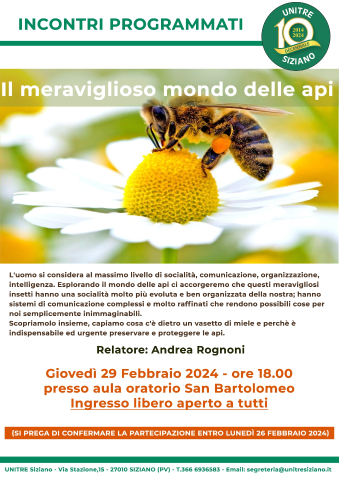 Si informano i cittadini che L'UNITRE Siziano organizza ''Il favoloso mondo delle api'', un incontro tematico che esplora il mondo delle api ne analizza la meravigliosa complessità sociologica, un sistema di inimmaginabile attuazione per la specie umana.