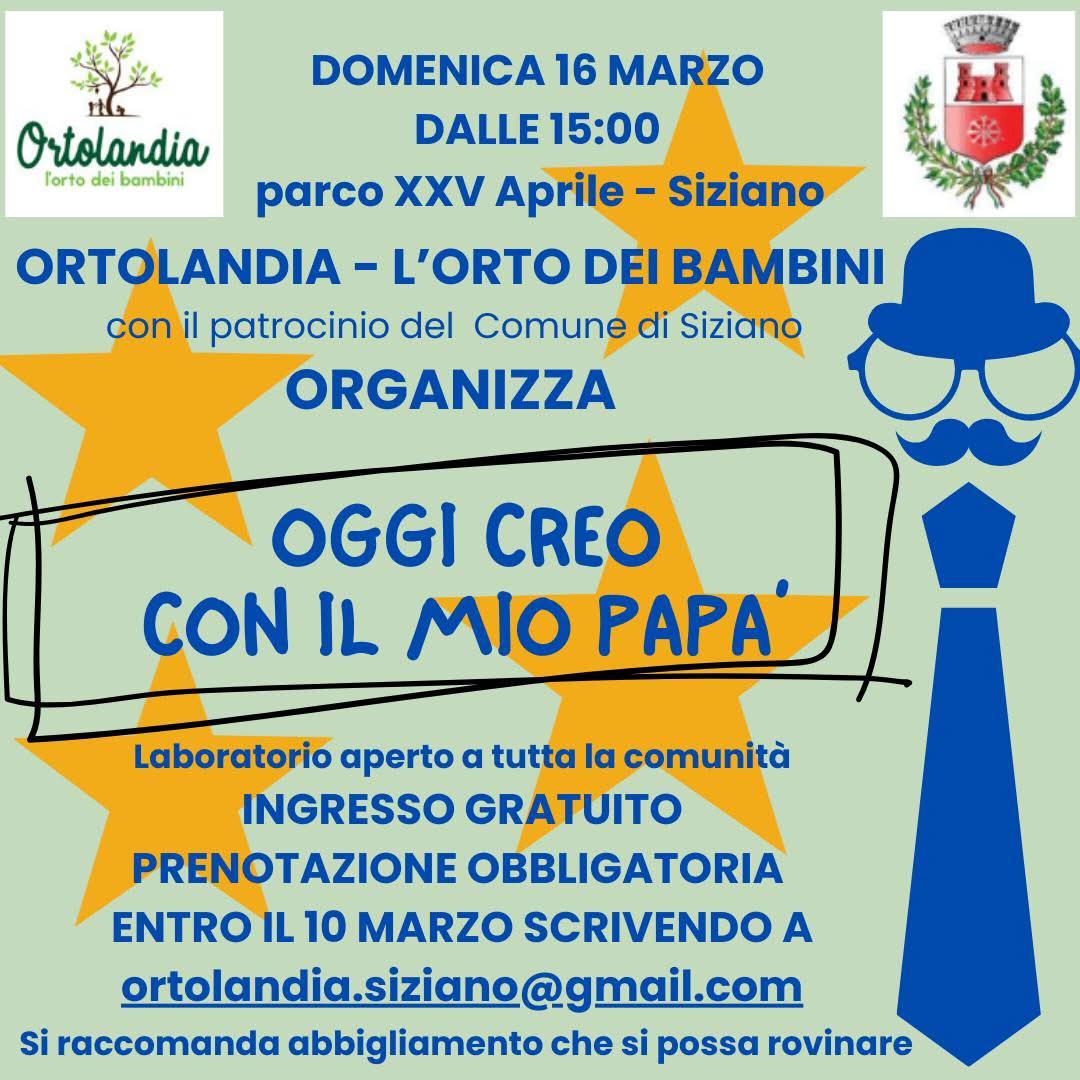 Si informano i cittadini che l'Associazone Ortolandia, con il patrocinio del Comune di Siizano, organizza l'evento "Oggi creo con il mio Papà": un laboratorio crerativo padre-figlio per celebrare la Festa del Papà.