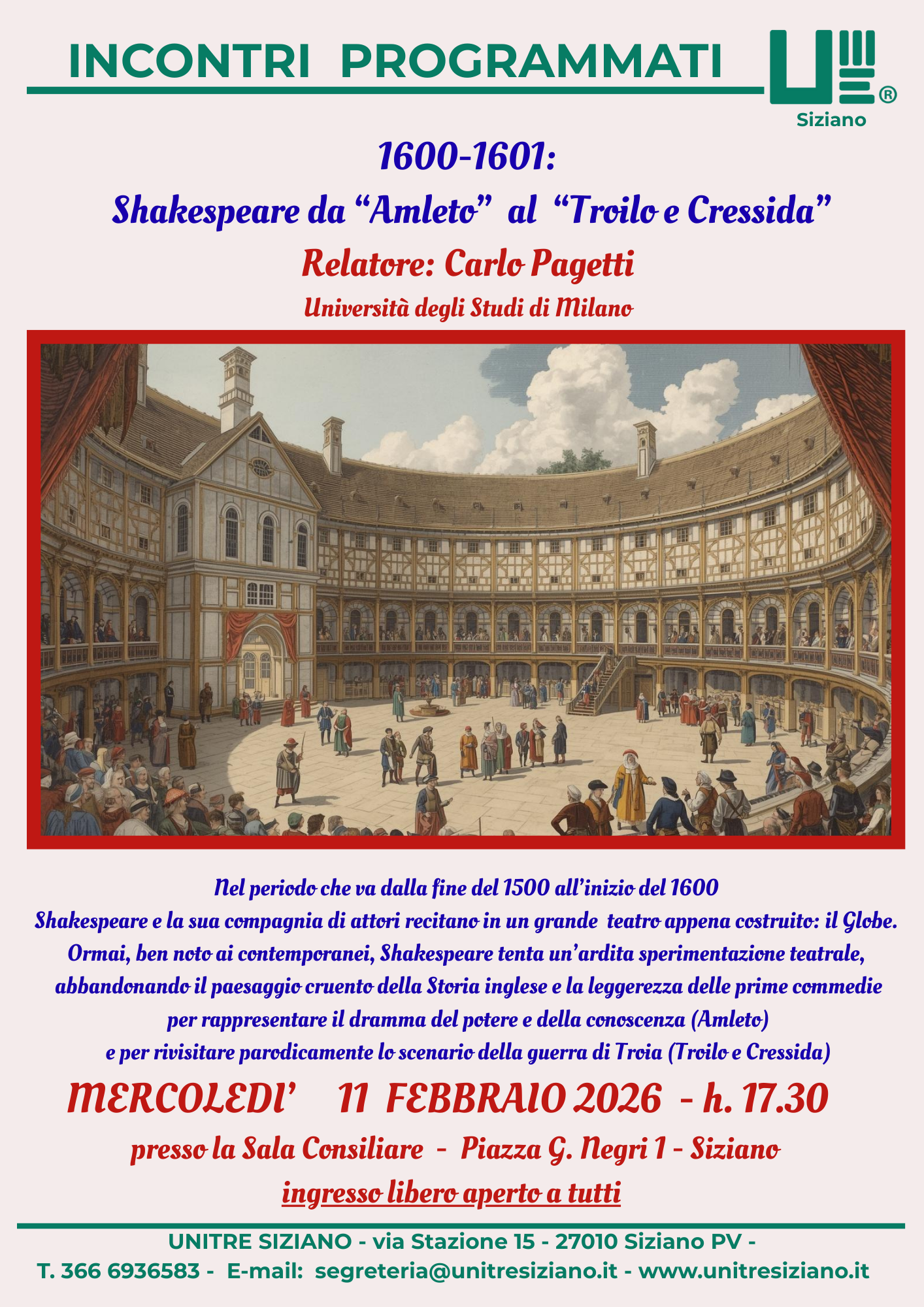 Unitre Siziano organizza un Incontro Programmato dedicato a Shakespeare e alle sue opere più sperimentali, che abbandonano il paesaggio cruento della Storia inglese e la leggerezza delle prime commedie per rappresentare il dramma del potere e della conoscenza (Amleto) e per rivisitare parodicamente lo scenario della guerra di Troia (Troilo e Cressida)