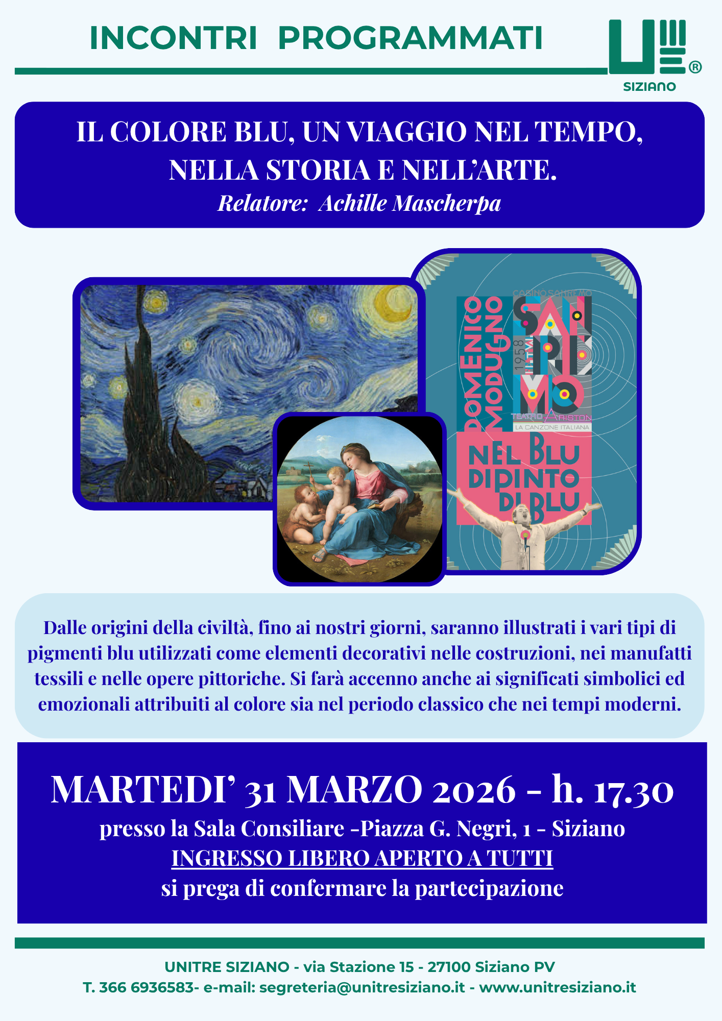 Unitre Siziano organizza un incontro programmato dedicato al colore Blu: dalle origini della civiltà fino ai nostri giorni, saranno illustrati i vari tipi di pigmenti blu utilizzati come elementi decorativi nelle costruzioni, nei manufatti tessili e nelle opere pittoriche. Si farà accenno anche ai significati simbolici ed emozionali attribuiti al colore sia nel periodo classico che nei tempi moderni.
