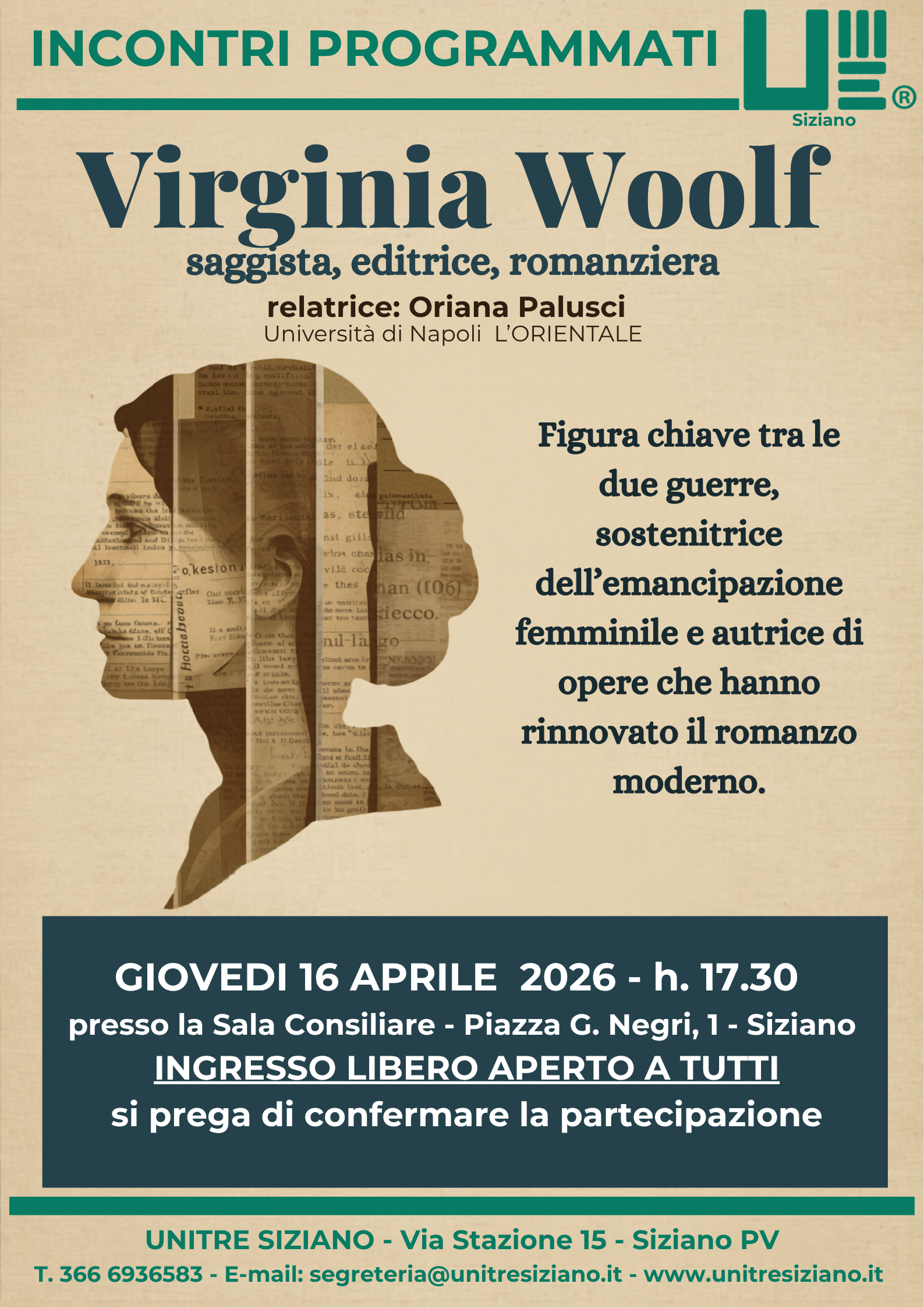 Unitre Siziano organizza un incontro programmato dedicato Virginia Woolf: saggista, editrice, romanziera...una figura chiave tra le due Guerre, una sostenitrice dell'emancipazione femminile e un'autrice che ha rinnovato il romanzo moderno.